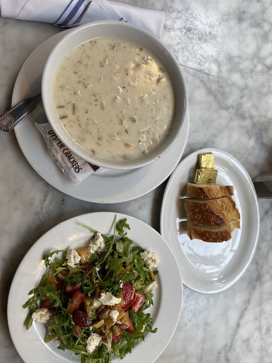 We sat outside and it was the perfect sunny day out with the amazing view of the bay. The service and staff were friendly and helpful. Food: The clam chowder is what they’re known for and my husband enjoyed the seasonal pumpkin bisque. The scallops were well cooked and the garnish underneath helps add a kick of flavor. The fried seafood combo was really good and even though the seafood was fried, the meat inside was still juicy. The only letdown of the meal was the lobster roll. At first glance we were pleasantly surprised by the amount of lobster meat, but the meat was chewy and dry. Also, the roll was dry and hard to chew through as well. It seemed like an off day, so it may be better for other people on another day.